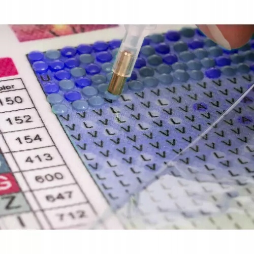 • do końcówki aplikatora pokrytej klejem przyklej diament i przenieś go w odpowiednie miejsce na płótnie