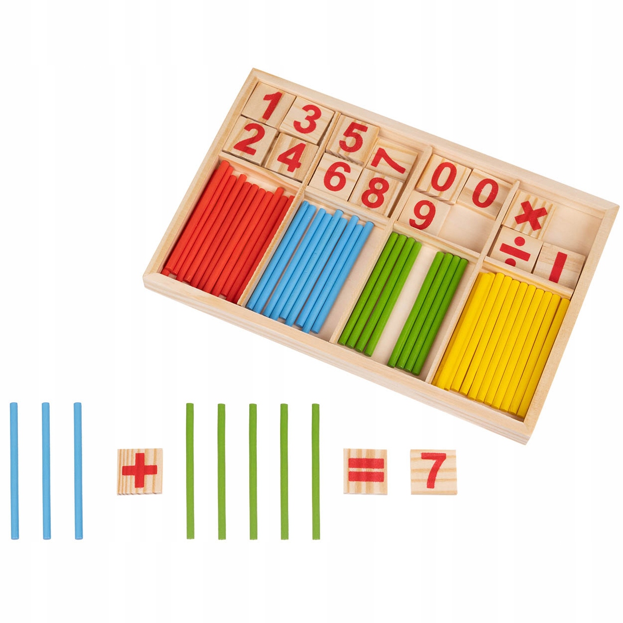 Zestaw obejmuje nie tylko patyczki do liczenia, ale również bloki z cyferkami i znakami matematycznymi. Tak duży zestaw ułatwia tworzenie prostych działań matematycznych, jak dodawanie i odejmowanie, a także tych nieco trudniejszych, jak mnożenie i dzielenie.