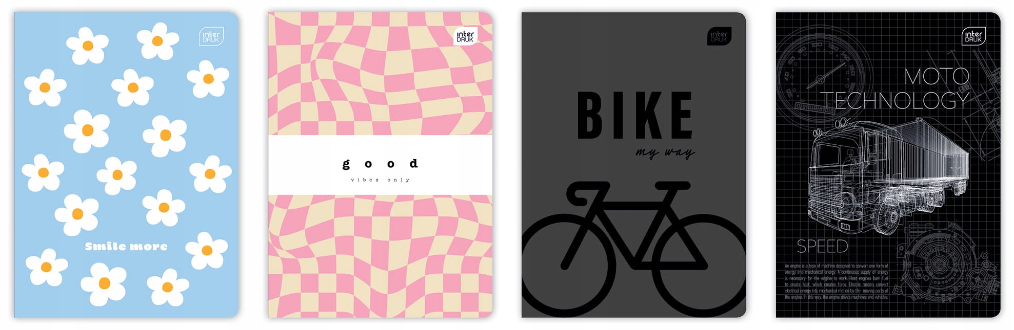Zeszyt szkolny w formacie A5. Okładka pokryta lakierem UV z zaokrąglonymi rogami. Duża różnorodność wzorów, dopasowana do grup docelowych.